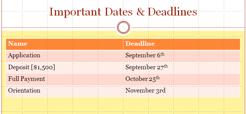Even before you’re accepted into your program, you will see how important deadlines are. Given that the wonderful people in the education abroad offices spend more time helping students already interested and signed up for studying abroad, they don’t spend much time sending university wide e-mails or promotional mailers to state university students about the opportunities available to them. By the time you have decided you’d like to spend next Spring in Prague, it’s already November and the deadline for Spring applications has passed. You figure that you’ll just submit an application for the following Spring, and then you forget about it, September comes and goes, and you’ve missed it again! A great way to avoid this is to create a checklists of deadlines as soon as you decide you want to study abroad. My checklist looked something like this: