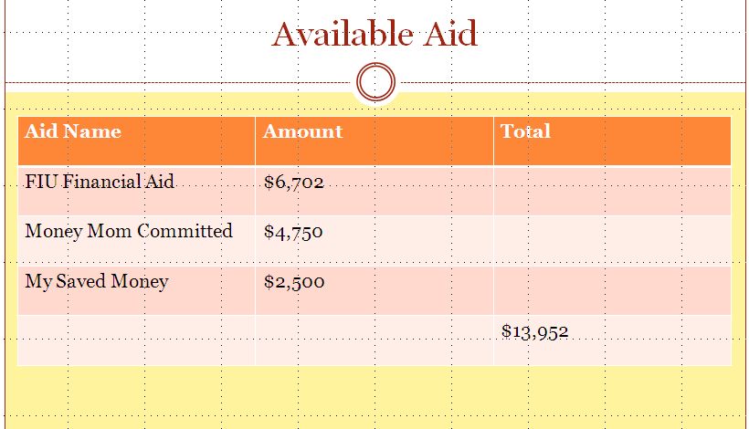 - Home items: One FIU pennant, one photograph of the beach, one small family photo album